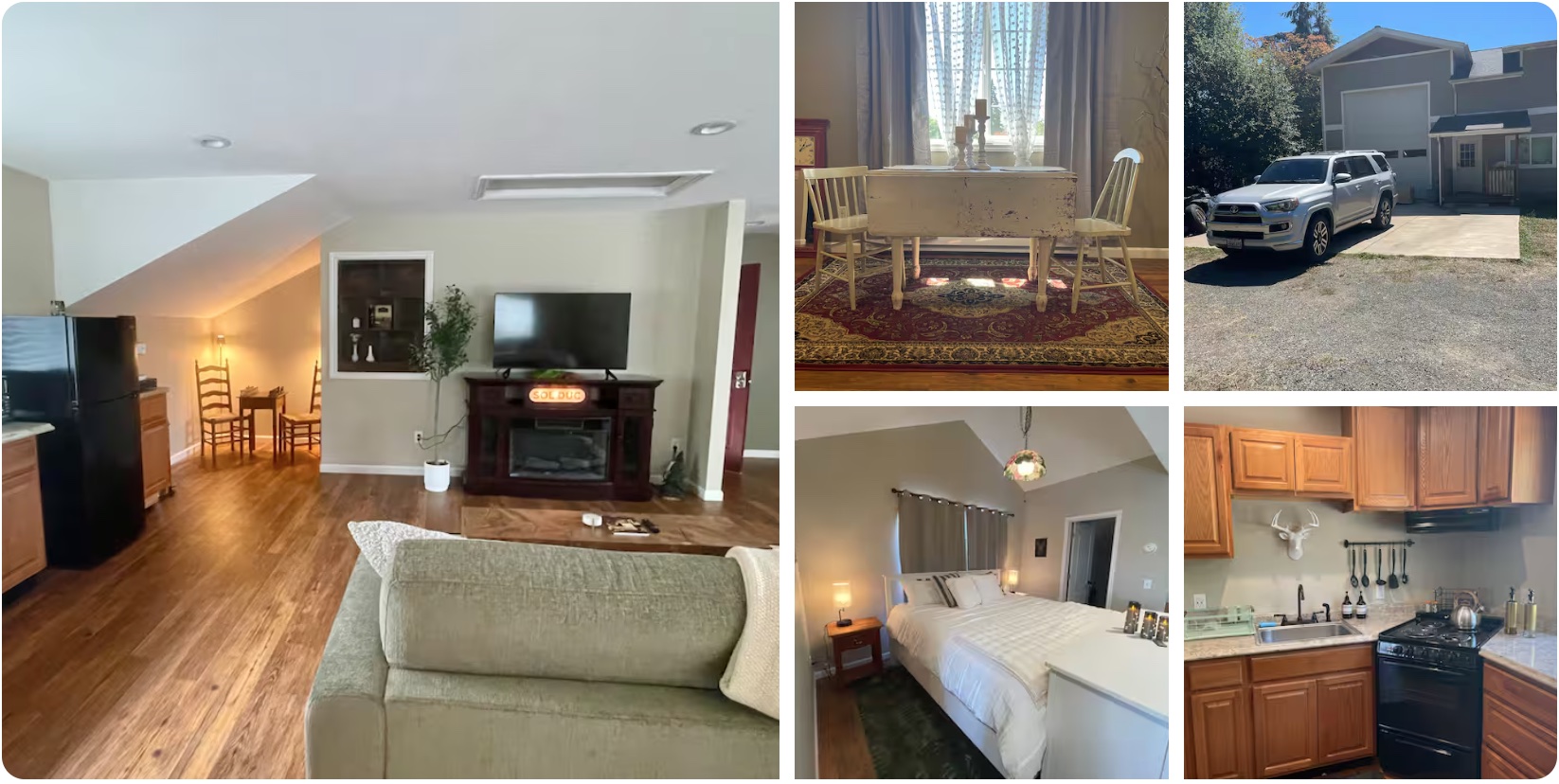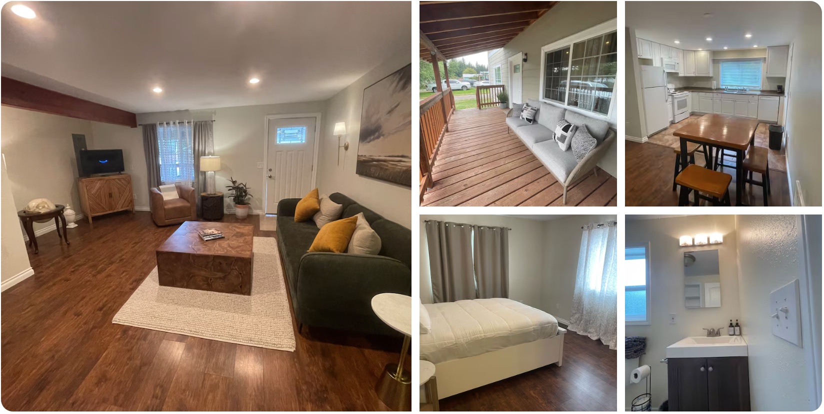 Newly remodeled one-bedroom suite featuring a private bedroom, full bathroom, cozy living room, and convenient kitchenette. Enjoy natural light throughout and step onto your patio deck overlooking the backyard. Clean, modern finishes and a comfortable layout make it perfect for couples, solo travelers, or extended stays. Close to Olympic National Park, local beaches, downtown Forks, and the hospital. Click to view.