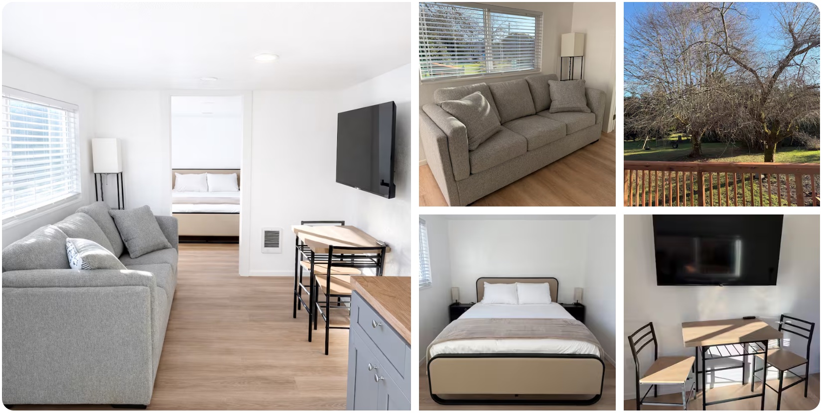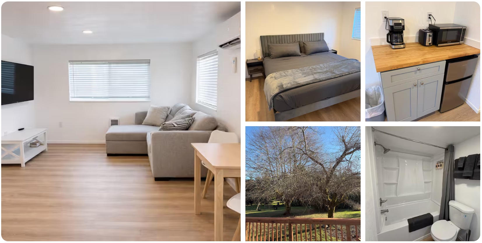 Newly remodeled modern studio featuring a comfortable queen bed, full bathroom with barn door, mini-split heating & cooling, mounted TV, and closet space. Clean, bright, and thoughtfully designed for a simple, relaxing stay. Located near Olympic National Park, local beaches, downtown Forks, and Forks Community Hospital. Perfect for solo travelers, couples, or travel professionals. Click to view.